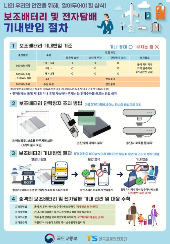 지난 1월 29일 김해공항에서 보조배터리로 인한 화재발생 사건 이후 2025년 3월 1일부터 보조배터리의 기내 반입 및 보관 규정이 강화되었습니다. 보조배터리는 여행 중 우리에게 꼭 필요한 물품이지만 안전하게 사용되지 않는다면 자칫 큰 사고로 이어질 수 있는 만큼 보조배터리의 규정을 잘 지키는 것은 매우 중요합니다.