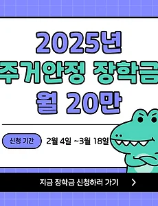 대학생 주거안정 장학금 월 20만원 지원 대상 및 신청방법. 이번 포스팅은 2025학년도 1학기 주거안정장학금 지원대상과 신청방법에 대해 정리해 드리도록 하겠습니다. 이 장학금은 대학생들의 주거비 부담을 덜어주기 위해 나라에서 마련한 제도입니다.   아래 내용에서 지원대상에 해당되시지 확인해 보시고 지원대상에 해당되시는 대학생 분들이라면  꼭 신청하셔서 주거비 부담을 줄여보시길 바라겠습니다  주거안정장학금이란?  주거안정장학금은 대학생들을 위한 장학금으로, 대학생들이 학업에 전념할 수 있도록 주거비를 지원해 주는 것을 목표로 하고 있습니다. 특히, 기초생활수급자 및 차상위계층의 학생들에게 큰 도움이 될 수 있는 제도이기 때문에 지원대상에 해당되는 학생들에게는 주거비를 지원받을 수 있는 좋은 기회가 될 수 있습니다. 이 장학금은 신청 기간이 정해져 있으니 놓치지 않.. 2025. 2. 11.